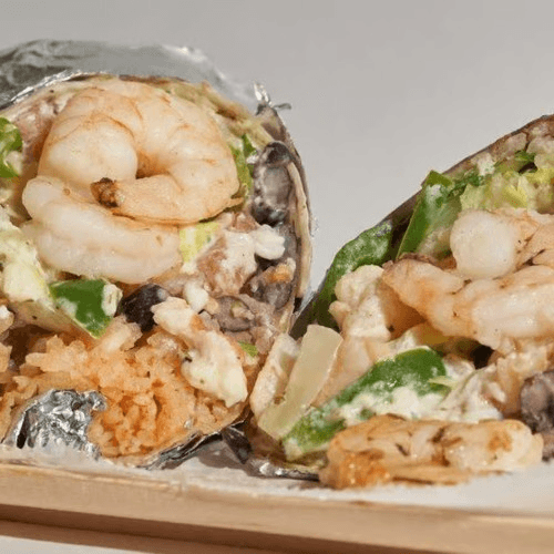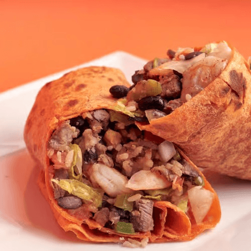 Flamed broiled Steak and prawns. Made with bell peppers, white onions and spanish rice, black beans. lettuce, fresh salsa.