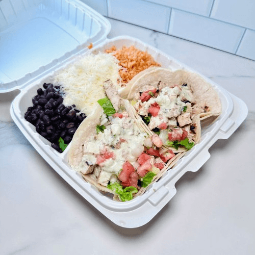 Two tacos, Spanish rice, black beans, lettuce, tomato salsa, sour cream and cheese. Garlic lime dressing.