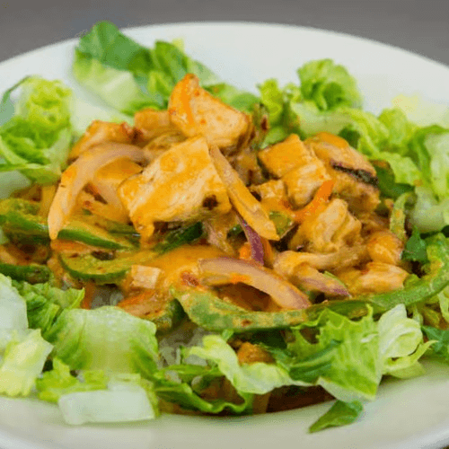 Sauteed & Spicy. Shredded carrots, bell peppers & white onions, lettuce, fresh salsa over jasmine rice.