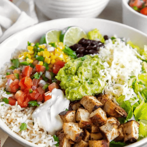 Chicken, Spanish rice, black beans, lettuce & fresh salsa.