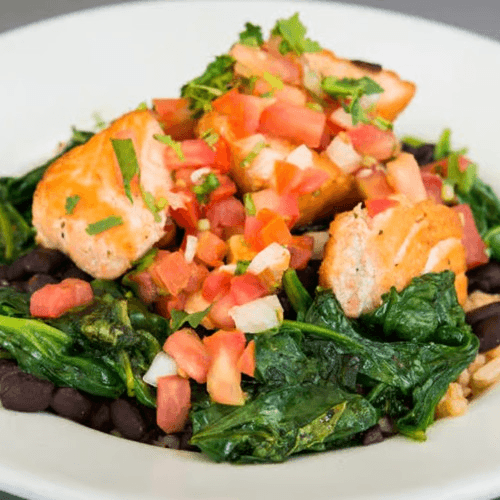 With fresh tomato salsa, Sauteed onions, bell peppers.