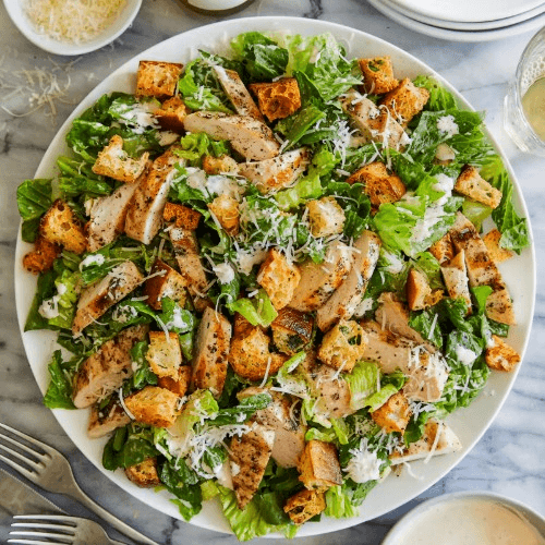 Served with Caesar dressing. Romain lettuce, Jack cheese, chicken.