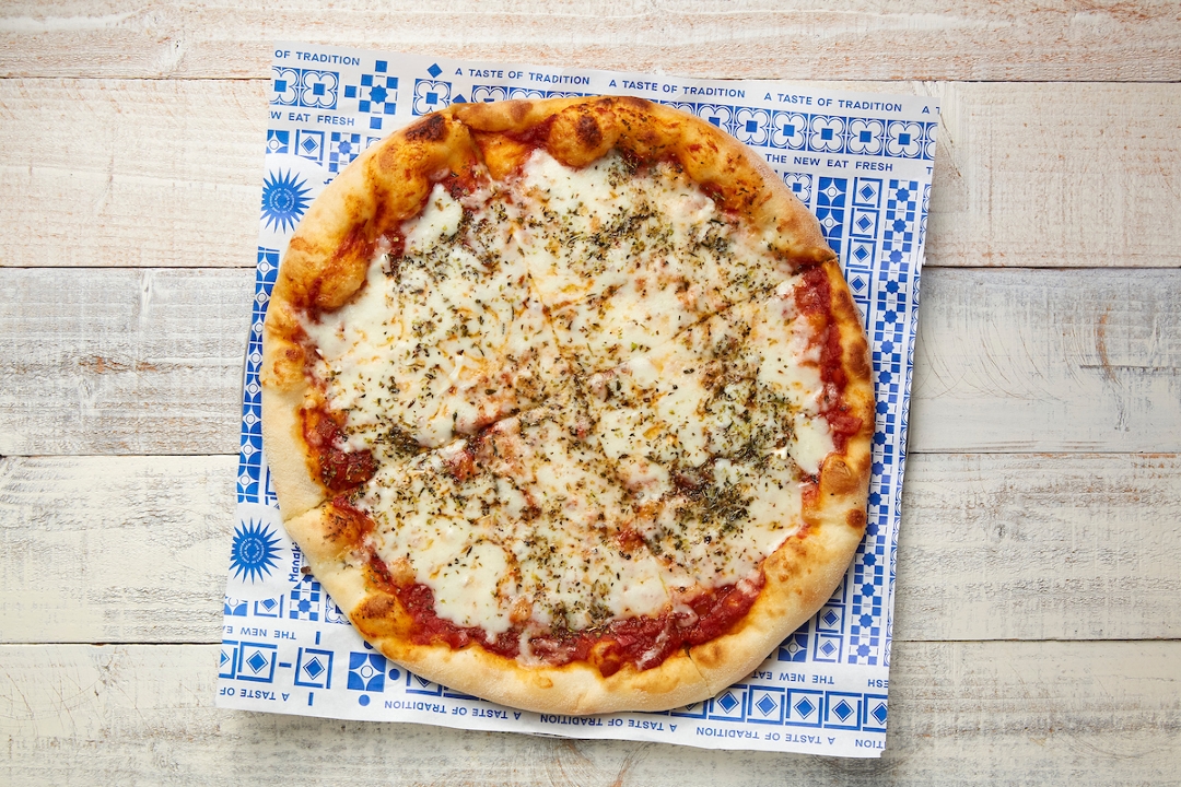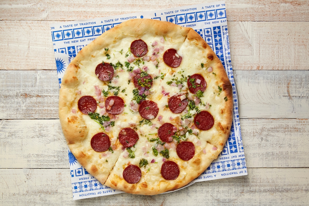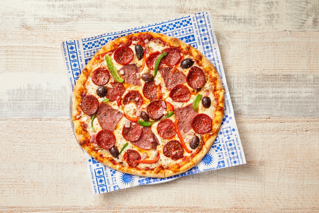 Shakshuka Sauce, Mozzarella Cheese, Halal Beef Pepperoni & Dried Herbs.