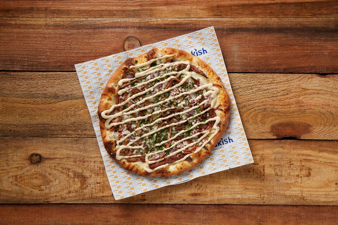Hand Shredded Mozzarella Cheese, Tri Tip Shawarma, Red Onions & Cilantro. Garnished with Tahini Sauce.