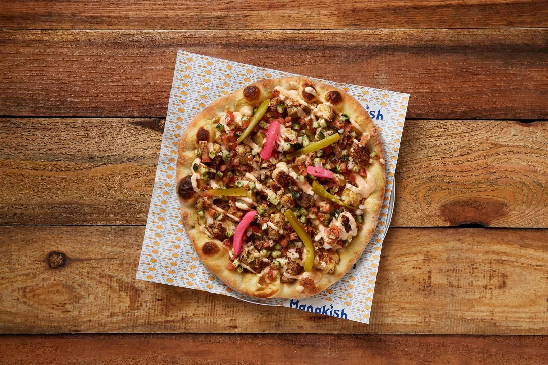 Lavash bread, Hummus Spread, Cauliflower, Eggplant, Lettuce, Cucumbers, Tomatoes, Onions, Pickles, Turnips & Harissa Sauce. Toasted in our brick oven.