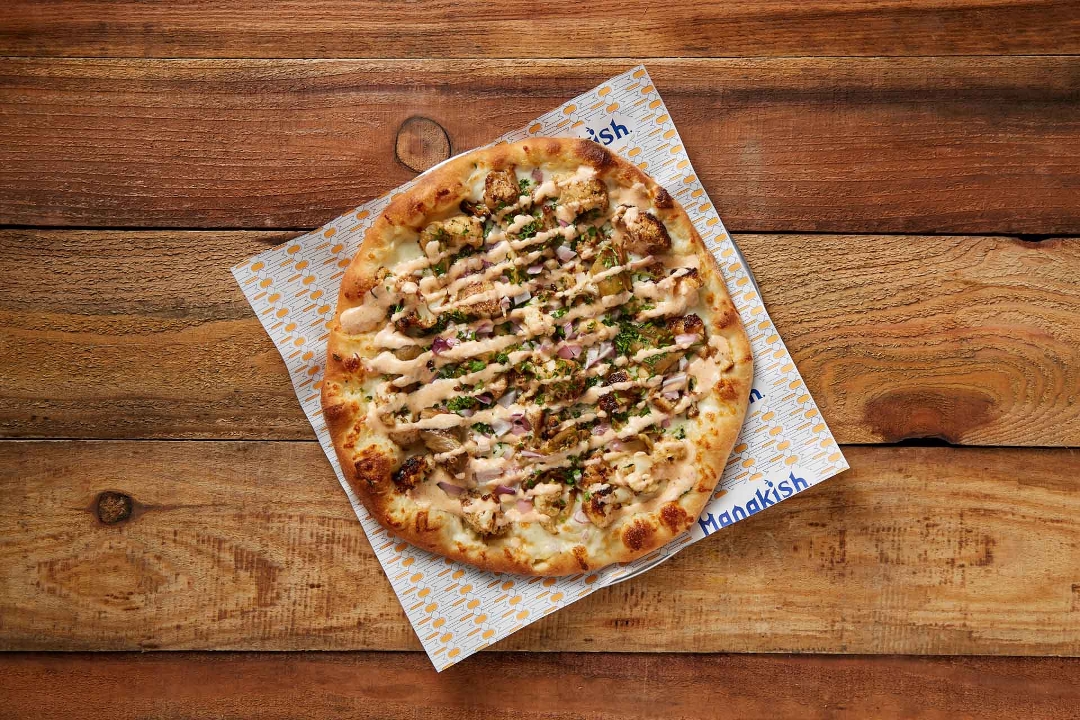 Hand Shredded Mozzarella Cheese, Roasted Cauliflower, Eggplant, Red Onions & Cilantro. Garnished with Harissa Sauce.