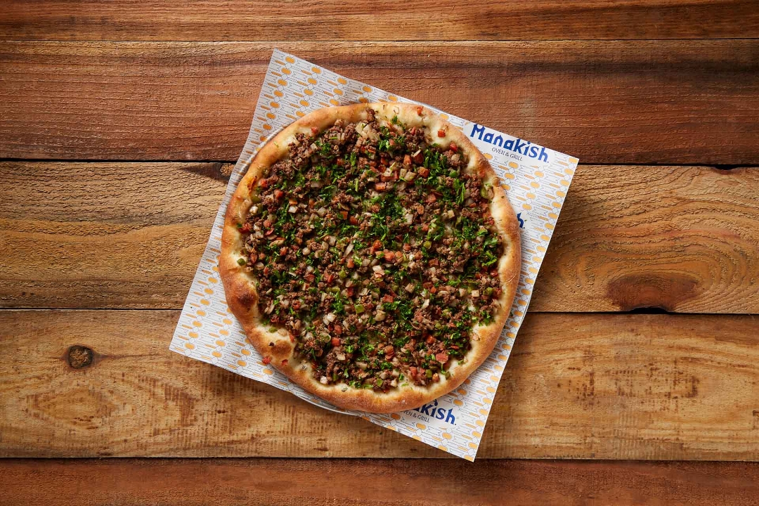 Hand Shredded Mozzarella Cheese, Spicy Lebanese Sujuk (Sausage), Red Onions & Cilantro.